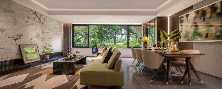 从独立电梯厅开始,归家的仪式感便油然而生。两梯两户的规制,给予业主专属的从容与私密。推门而入,约6.8米的奢阔大横厅与同尺度瞰景阳台无缝相连,形成开阔通透的公共空间。阳光在此肆意铺展,无论是亲友小聚时的欢声笑语,还是独自休憩时的静谧时光,都能与窗外的景致相映成趣,让生活充满诗意。