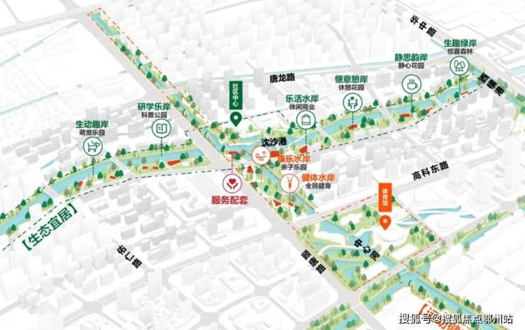 张江缺生态,唐镇就重构生态基底。最令人称道的“十字水街”规划,依托沈沙港和中心河打造连续滨水慢行网络,通过漫步天桥串联社区与公共空间,构建真正的蓝绿交融生态系统。