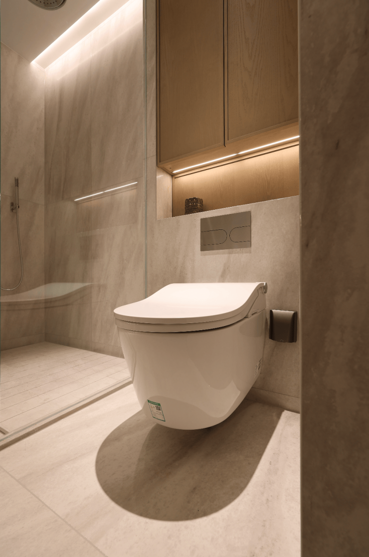 主卫淋浴花洒采用了德国当代Dornbracht ,并做了别具一格的嵌入式设计。花洒的底面与吊顶齐平,视觉与空间感更好。