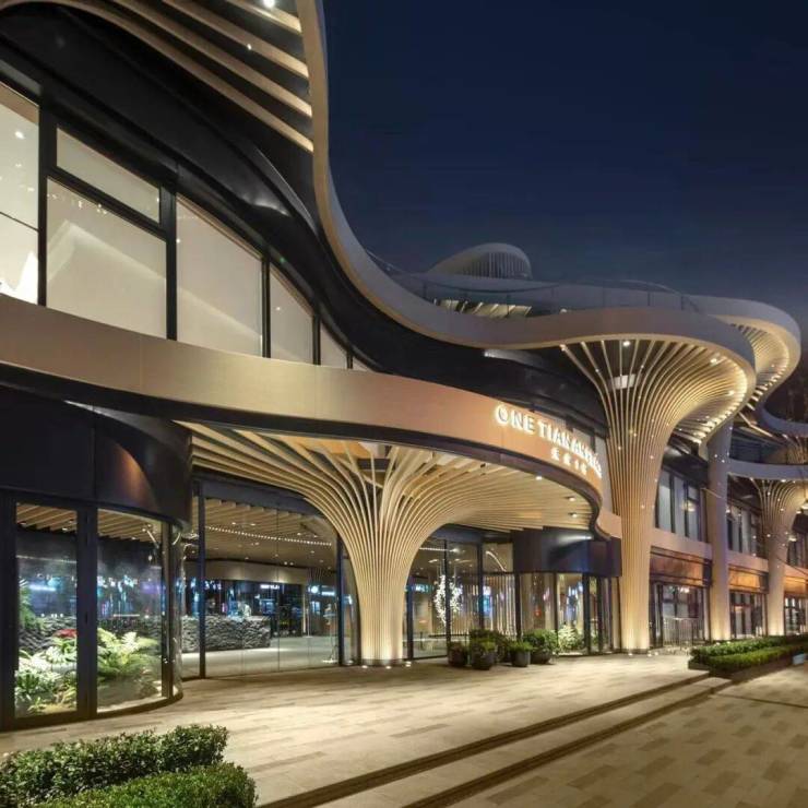 天安1号前期的住宅外立面选用铝板+石材,搭配大面积玻璃,颜值出众!