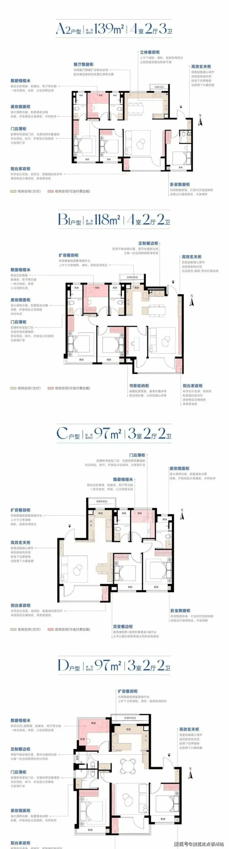 主力户型: 建面约 97-139㎡的三至四房,其中 97㎡为三房,118㎡和 139㎡为四房。