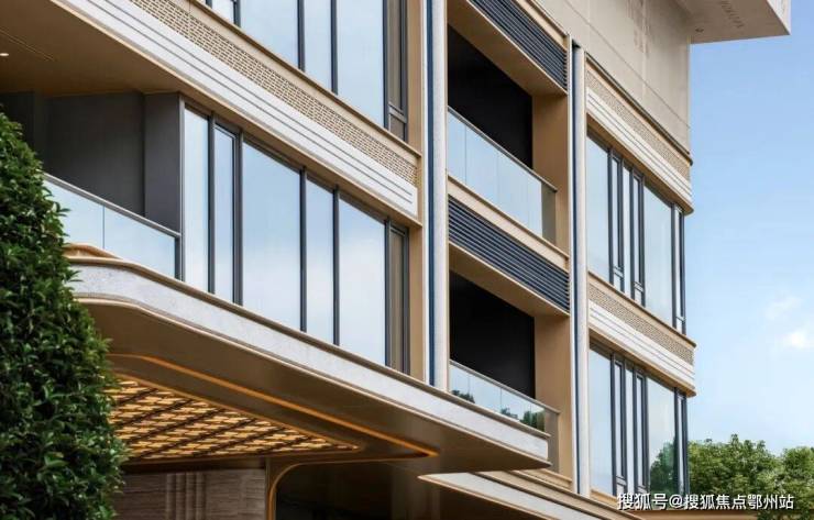 建筑立面 采用香槟金铝板配合大面玻璃,细部使用美国灰麻石材,辅以精致金属线条,钢琴漆工艺波浪铝板,一看就很贵气,很有辨识度。