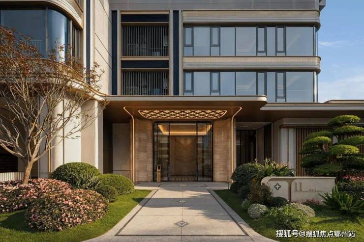 项目大门采用了杭州首个Art Nouveau的新艺术风格, 入口横贯约80米,主楼约40米 ,大门由六扇曲面奢石墙体构成,采用大面积的维多利亚白奢石,端庄典雅、恢弘大气。加之大门顶部设计“金色流苏”装饰、曲线设计,工艺非常考究,当之无愧的城市级封面。