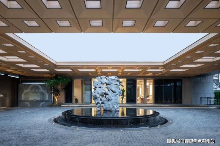 项目入口回溯运河之形,以酒店环岛式落客设计提升归家体验感,顶部采用中式博古架元素,营造古色古香的氛围,极具昭示性的水景和点景雕塑划定峯层领域。
