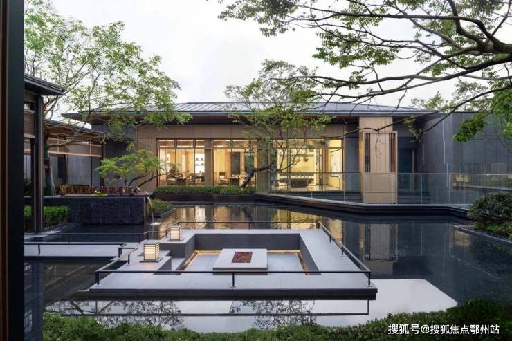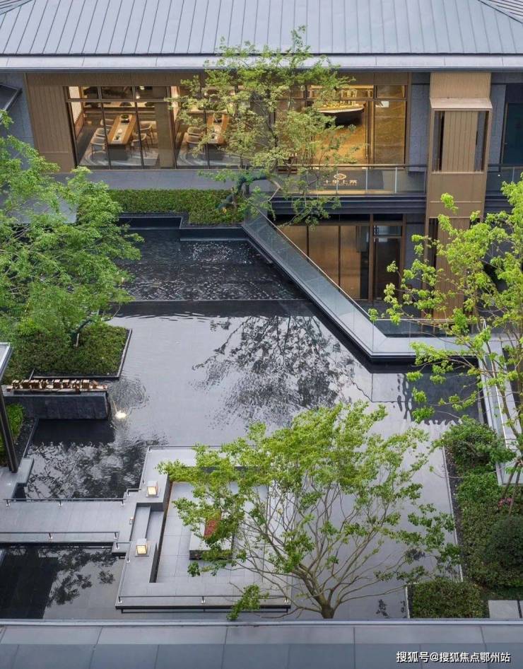 融入中国古典园林的造园手法,以曲折迂回的景观连廊,围合一方中心水院空间,同时通过廊的收放转折融入休憩空间,打造室内外一体化的东方静谧水院。