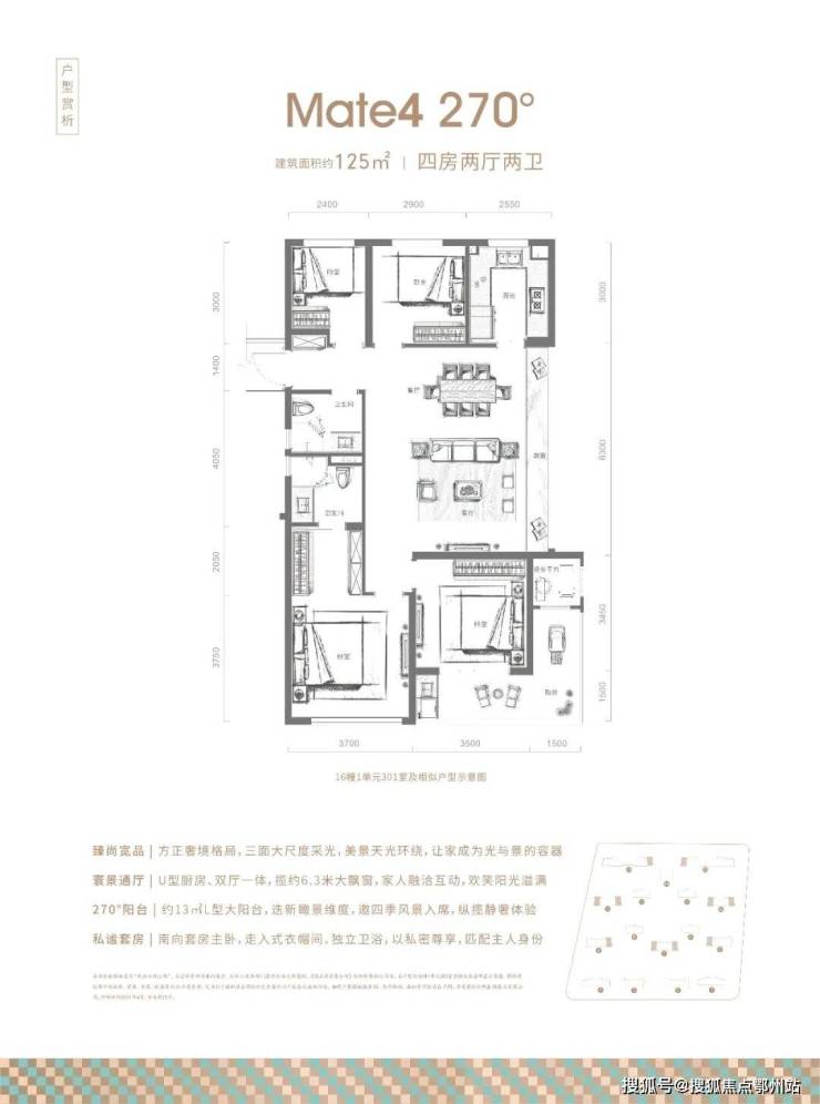 最值得期待的还有建面约125㎡的四房两卫户型,主卧豪奢体验,步入式衣柜更具套房感受, 惊喜的是次卧,竟然带有一个270°L形的转角阳台。