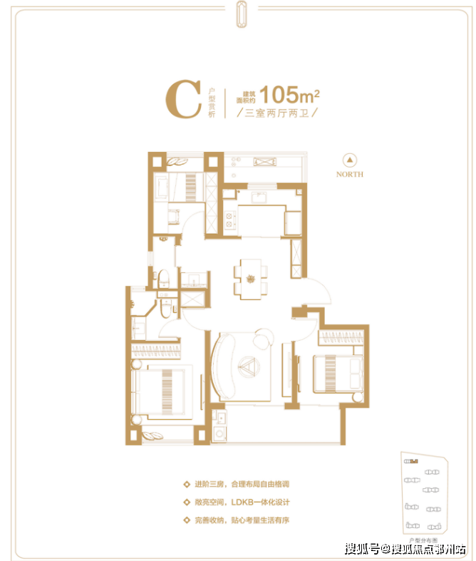 建面约105㎡ 三房两卫(品质首改):专为追求居住舒适度的首改家庭打造,核心价值点在于“全明通透+双卫设计+大面宽采光”。户型方正无浪费,动静分区清晰;主卧套房设计,配备独立卫浴空间,保障业主私密尊崇;客餐厅连通外接阳台,通风采光效果极佳,无论是家庭聚会还是日常休闲都尽显从容;三房设计满足家庭多元居住需求,儿童房、老人房或书房均可从容规划,总价约380-420万,适配预算充足的刚需升级家庭。
