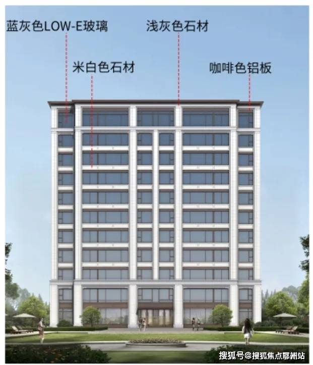 洋房部分外立面为浅灰色、米白色石材搭配蓝灰色LOW-E玻璃、咖啡色铝板。