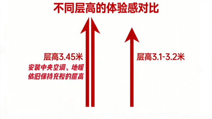 约3.45米的层高 更是一大杀手锏——当大多数顶豪停留在3.1-3.2米时,多出的这25-35cm,就是豪宅“呼吸感”的来源。即使安装中央空调和地暖后,依然能保持充裕的室内净高。