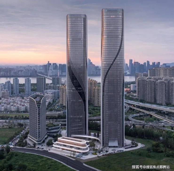 两幢超高层建筑与高层公寓、多层配套辅楼交相呼应。设计从建筑的在地属性出发,将钱塘江奇特的 潮汐现象以抽象的手法提炼出来,.