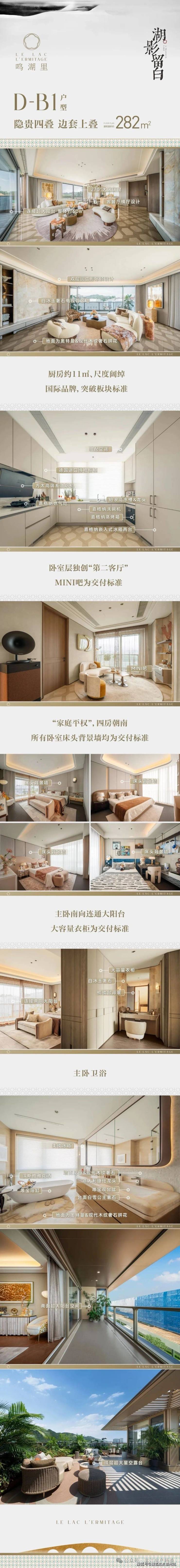 叠排的话有144套,面积小一点,223到282平。四层的是上下叠,六层的是上中下叠。外立面设计得特别简洁大气,屋顶还做了飞檐的设计,跟周围环境特别搭,感觉像住在度假区一样。层高有3米2到3米4,采光也超棒,有些户型还能270度看风景呢!