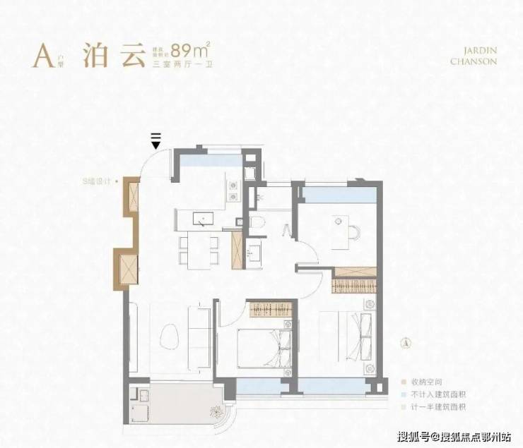 建面约89㎡3房2厅1卫户型: