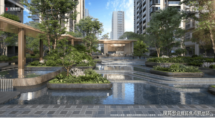 三重·水院之奢,沉浸于无界。 约350平方米的核心水院的涟漪勾勒“远山如黛,秋水含烟”之境。跌水、浮岛、精选花木的视觉平衡,在动静间辉映。