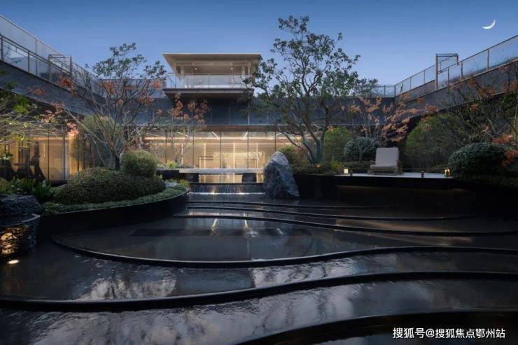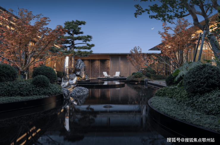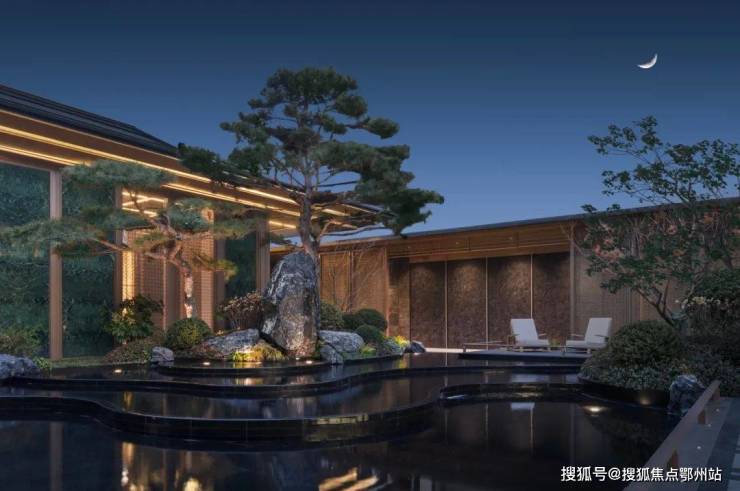 往里走,穿过约200㎡的漂浮感水院,还有以宋式园林为蓝本的下沉式庭院景观,名贵树种、叠石和造型小品,被设计“漂浮”于水景之上,站在一旁的连廊下,一抬头、一转身,都能有不一样的景致。