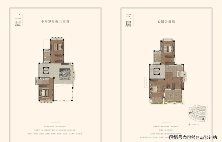 二楼:带有2个卧室,北卧室连接北向超大露台,南卧室带有独立的阳台。三层是一个超级豪华的套房,带有小书房设计,更有南北2个露台;