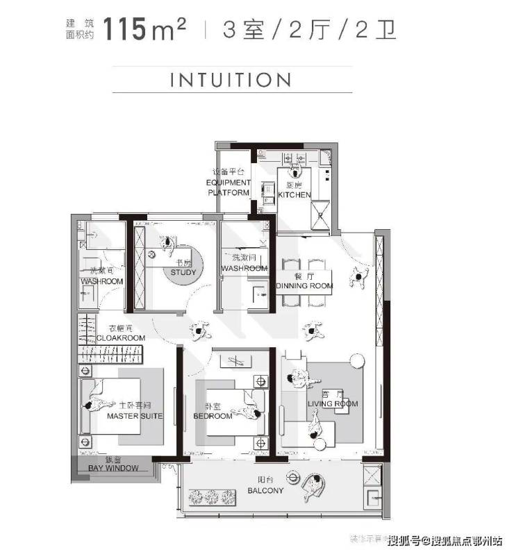 建面约115㎡三房两厅两卫: 入户花园+餐客厅一体化+三开间朝南+南向双阳台+观景飘窗+双卫,非常适合初改家庭。