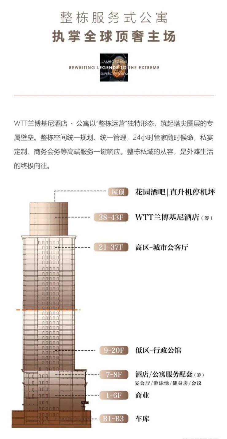 WTT兰博基尼酒店·公寓售楼处电话:400-112-0302【售楼中心】WTT兰博基尼酒店·公寓售楼处提供107-381㎡大平层,总价900万起,含健身房、泳池等设施,价格8.5-12万/㎡,电话400-112-0302。