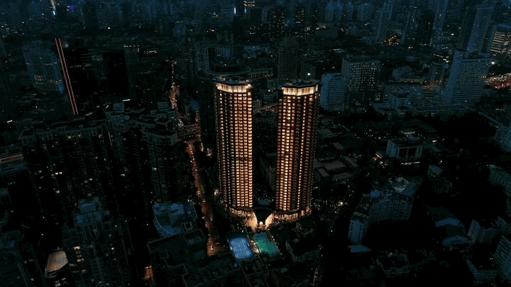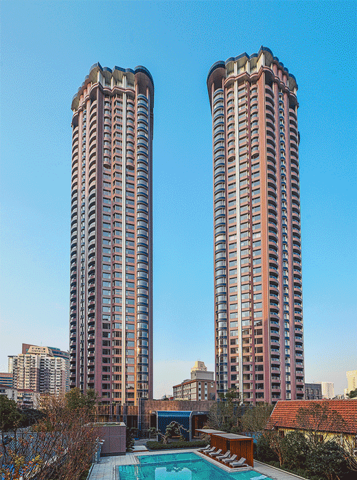 华山公寓为摩登的双子塔建筑,塔楼的造型灵感来自18世纪欧洲新古典主义建筑英皇阁,象征了上海文化的多元和包容。建筑外立面采用ALUCOBOND材质,一层外墙运用繁复的掐丝珐琅技艺,一眼望去带来令人难以忘怀的独特印象,既有现代的庄严稳重,又不失古典的细致与贵气。