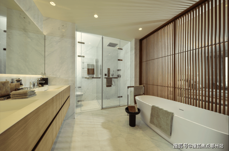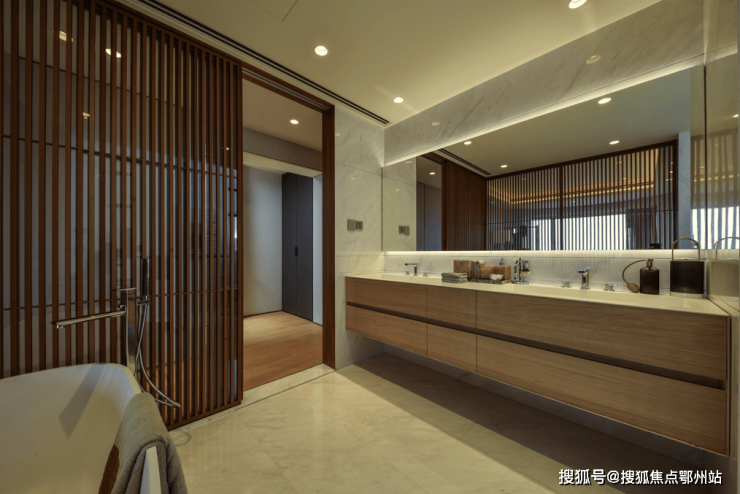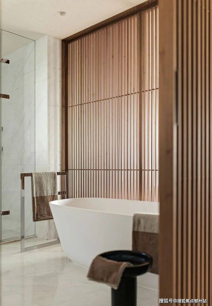卫生间选择浅色大理石作为地面,与原木色格栅相搭配,清新雅趣,带来轻松舒缓的心情。意大利ANTONIO LUPI的卫浴家具、瑞士Laufen的陶瓷卫浴产品、GESSI的龙头和卫浴配件等,都凸显了顶级质感。