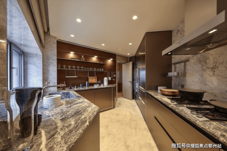 华山公寓厨房的空间设计皆打破传统理念,多边形走线充分利用了不同的角落。厨房中的Boffi顶级橱柜、由Sub-zero打造的嵌入式冰箱,以及Gaggenau的整套厨房电器,构造出空间流畅的线条。