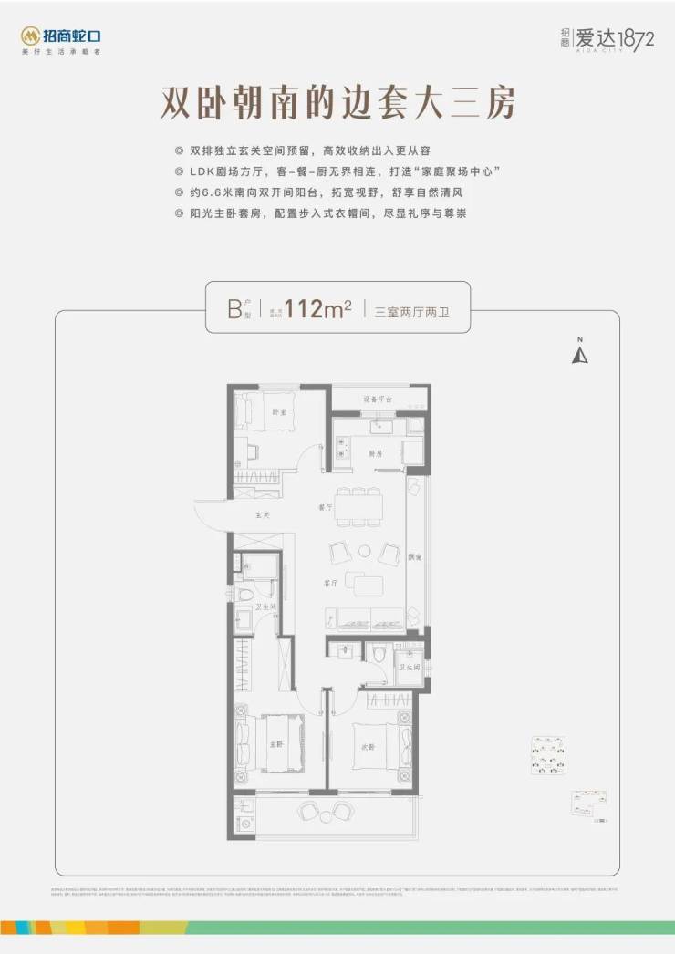 建面约112㎡三房两厅两卫: 超大尺度的一体化餐客厅公区空间,面积约达29㎡,北接U型厨房,南连“跑道式”阳台,动线布局合理,极大地拓宽了场景空间尺度。