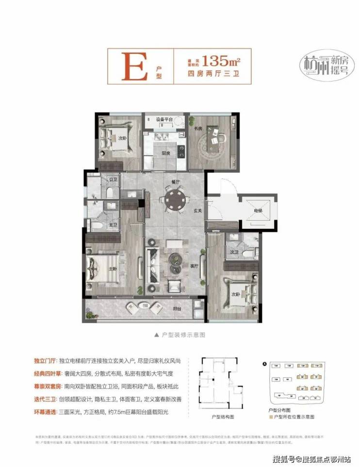 约135㎡户型点评:独立门厅:独立电梯前厅连接独立玄关入户尽显归家礼仪风尚,经典四叶草:奢阔大四房,分散式布局,私密有度彰大宅气度,尊崇双套房:南向卧皆配独立卫浴,同面积段产品,板块祗此,迭代三卫:创领超配设计,隐私主卫,体面客卫,定义富春新改善,环幕通透:三面采光,方正格局,约7.5m巨幕阳台盛载阳光