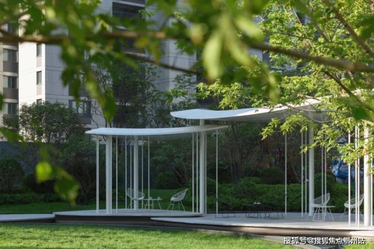 两叶飘动的白帆错落叠放,轻盈流动,仿佛花园中一直都有风在吹