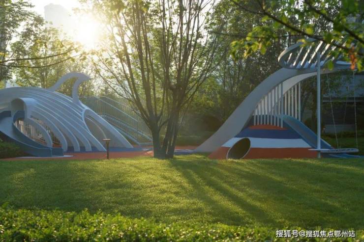 设计采用海洋主题元素,用跃起的鲸鱼抽象造型塑造场地,通过鲸鱼主题游乐器械与一系列地面图案及微地形的设计,还原儿童世界的纯粹本真,为孩子们打造自由地玩耍的“鲸鱼乐园“,仿若在海岛中穿梭,追逐海浪、浅滩戏水、海湾航行……