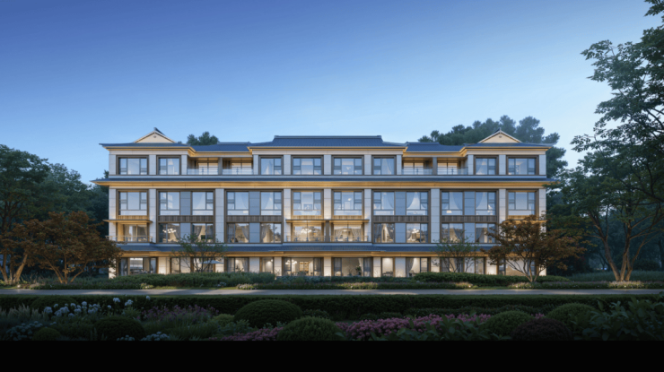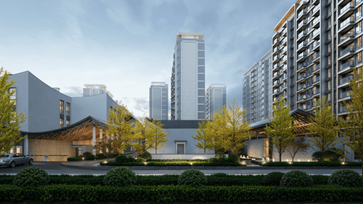 项目整体建筑以现代简约建筑风格为主,部分为中式建筑和周边历保建筑相呼应。立面采用不对称构图,以精致的线条作为主要的表现元素,采用金属、玻璃等现代材料,营造线条流畅、强烈的对比效果。强调建筑的功能化,注重科学性和实用性,居住更加便利。提升叠拼建筑的豪宅感,运用周边历保建筑的坡顶元素,形成简洁而富有层次感的外观。