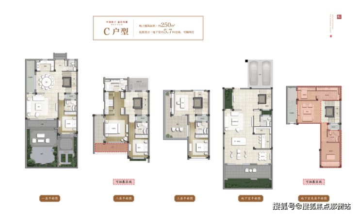 凡是一楼设计了老人房的,必是带卫生间的套房,对长者特别友好。以约250㎡C户型为例,开间约9.6米,做到了整整4个套房+1个书房。