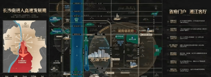 省府主城核心,总投资约316亿元,定位为“省府门户,湘江客厅”,坐享约2.76公里滨江岸线,约70%省级行政机构,60余家重点企业总部林立,约70亿奥体中心,约48亿国家医学中心等省级重点项目环伺,区域发展进入高速发展期。