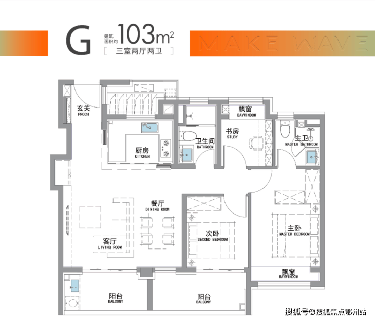 建面约103户型,南向超大面宽+双阳台,品质三房的不二之选!