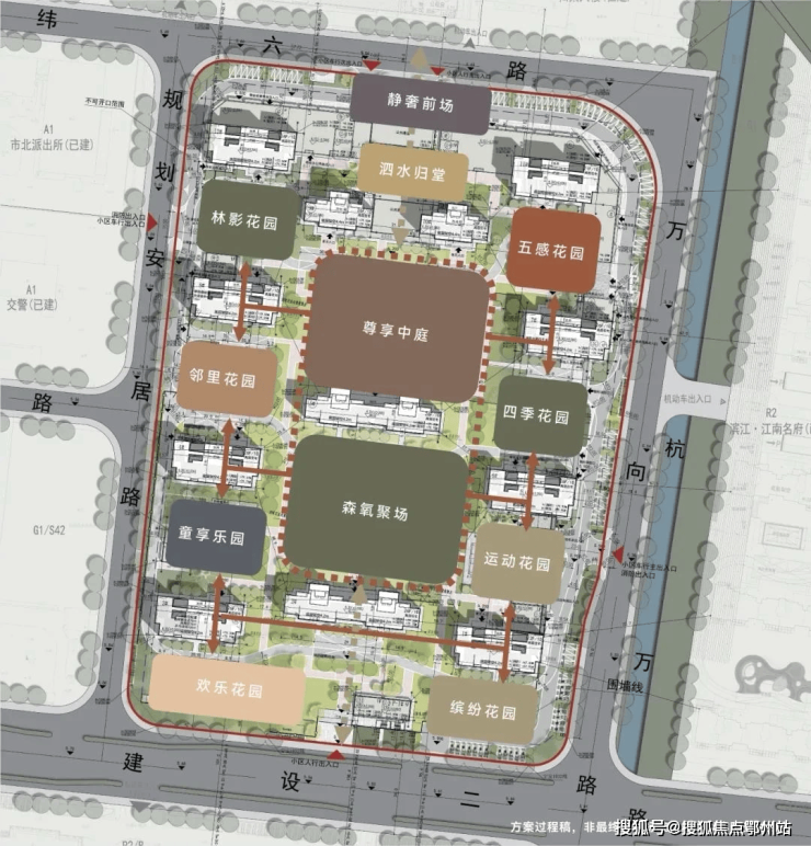 切换到小区主入口,以院落、水景、长廊形成了系统化场景串联,以泗水归堂为节点,把喧嚣城市代入静谧园区,形成酒店般的归家感受。