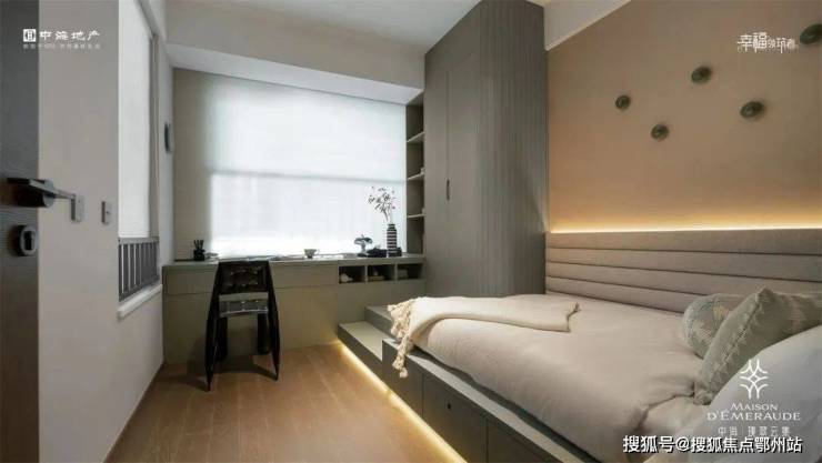 全屋约14.6米大面宽的尺度,让三个卧室都能够直面南向采光,实现阳光平权。主卧是豪华套房,除了飘窗、独卫外,由于空间够大,不论是衣帽间的梳妆打扮,临时办公等,也都能在主卧空间内实现。