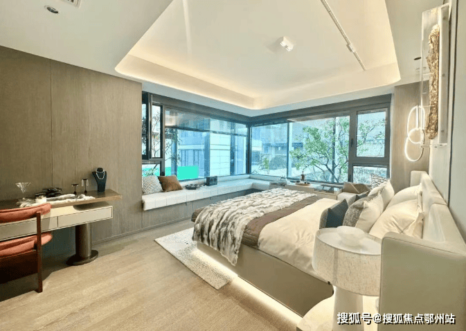 主卧套房设计,创新打造 270°景观飘窗,有效延伸室内空间及功能,景观视野绝佳!
