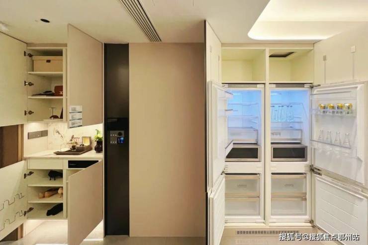 厨电配置 方太的顶配系列:上方送风下方吸油烟的空调油烟机、灶蒸烤一体机;客厅配置 内嵌式卡萨帝双拼冰箱;客厅 大理石岩板电视背景墙面、弧形吊顶均为交付标准;