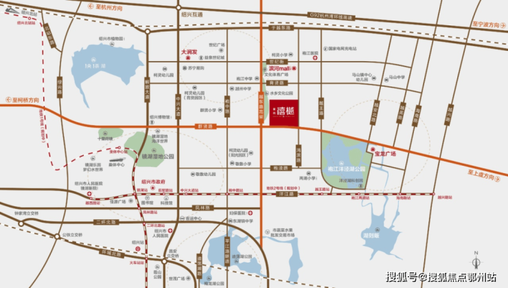 傲踞越东快速路与群贤路“十字中轴”上, 群贤路 东西贯通上虞、镜湖、柯桥三区, 越东快速路 畅达主城与绍兴高速口,一纵一横,执掌城市脉络。