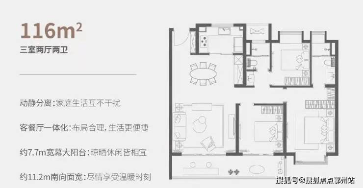 世茂璀璨未来本次首开建面约 98㎡、116㎡两大户型产品,多开间朝南、宽景阳台,三房两卫起步,满足刚需/刚改客群对居住尺度的要求。