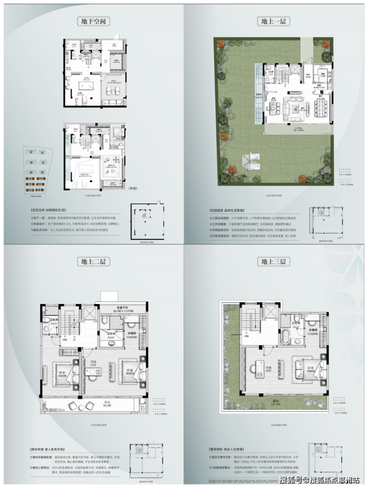 建面约173-174㎡下叠:分为地下一层、地上两层,四室两厅三卫设计。