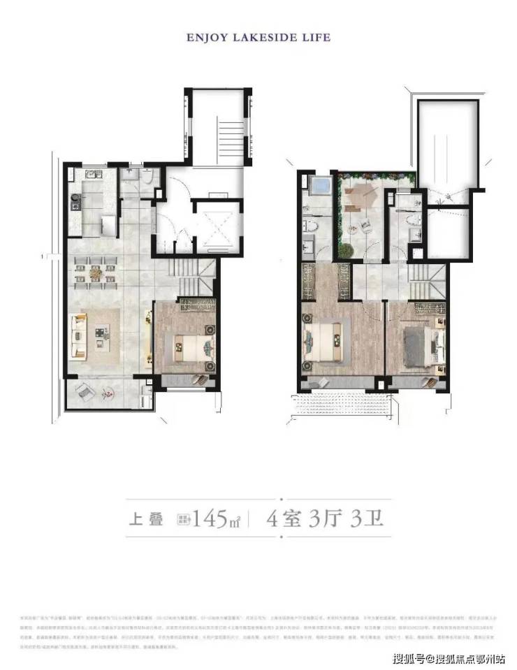叠加:145㎡上叠、155㎡下叠(4层设计,南北双花园)