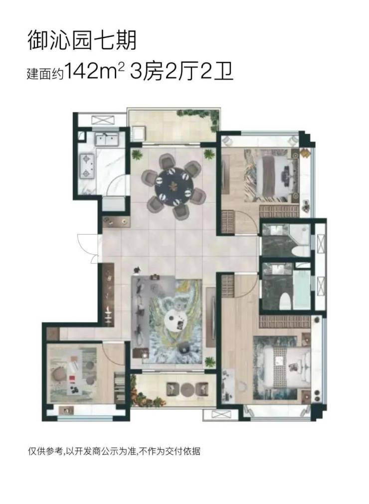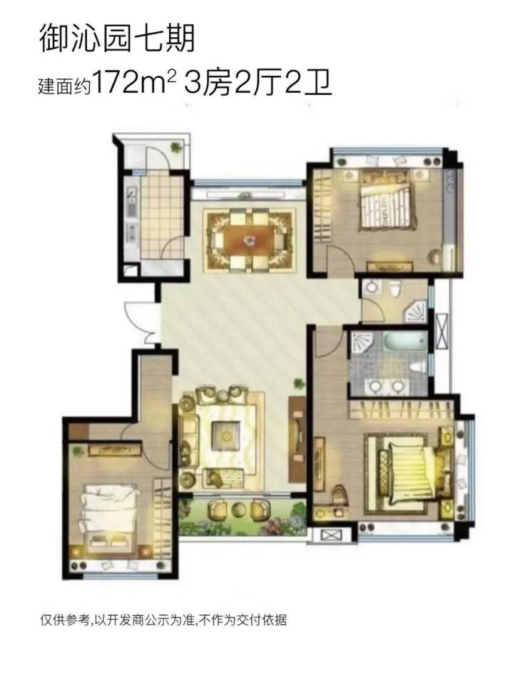 【御沁园】七期将推出3栋18F高层住宅,两梯两户无连廊设计;将推建面约132~172㎡三房户型,其中: