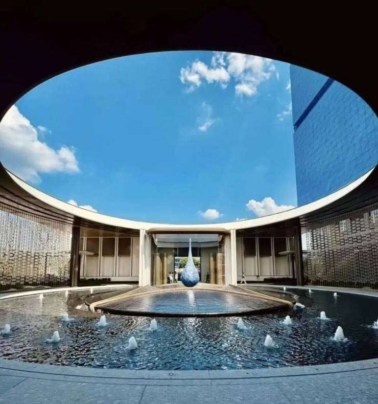 二进 弧光织境 ,讲究“天圆地方”、“四水归堂”,中心水滴造型雕塑,形如宝瓶美轮美奂。