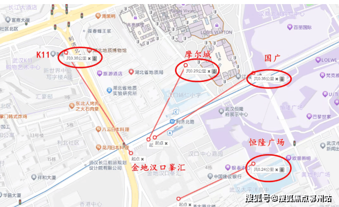 商业上,小区被武汉高奢商场环绕,最近的就是恒隆广场,步行200米左右就到了,同时摩尔城、K11、武汉国际广场距离项目的直线距离也不超过400米。