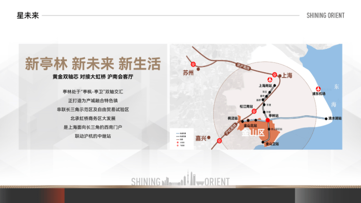 双轨加持 ——距离金山铁路亭林站约2.5km,5站到上海南站,轨交南枫线(规划)串联上海南部客流主动脉