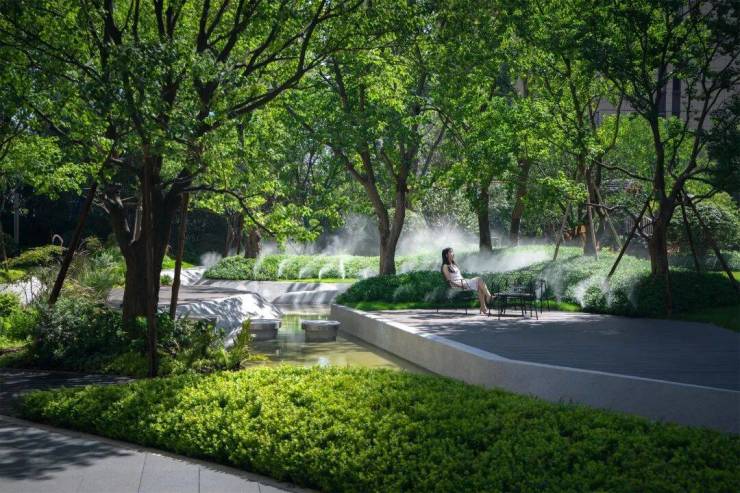 项目整体以摩登东方为核心造景理念,营造一环两轴N组团的景观布局,将花草、树木、流水、山石、景墙编织成序曲语言,在浮躁与喧嚣的城市中,用宁静温润的语言将摩登东方的惬意美好娓娓道来。