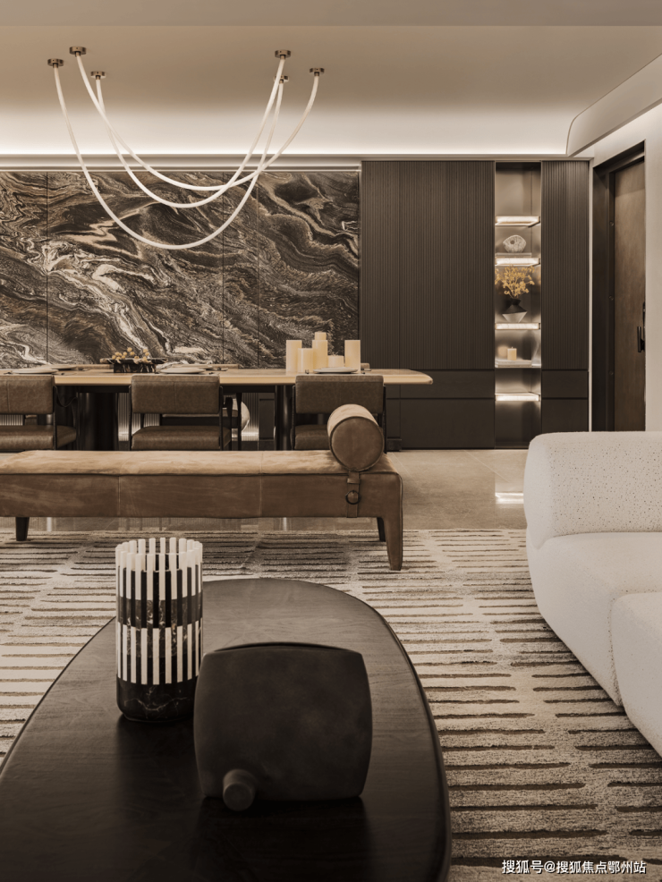 细密精致线条的木饰面与高贵石材结合奠定了经典纯粹的美感。所有休憩空间全部采用无主灯设计,柔和布光,且从公区到衣帽间,至卧榻一步步光影由明转暗,逐步带来放松的感受。