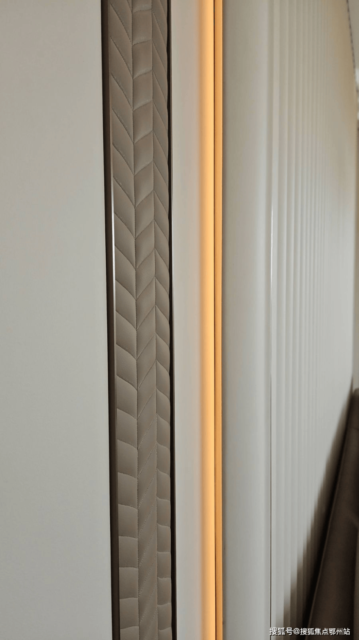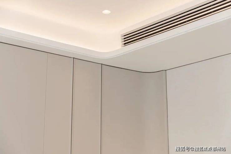 踏入样板间的第一秒,你会发现这里 几乎“看不到一个直角”:墙面转角、吊顶边缘、门套线条,甚至石材台面与柜体边缘,均以流畅圆弧替代生硬直角。