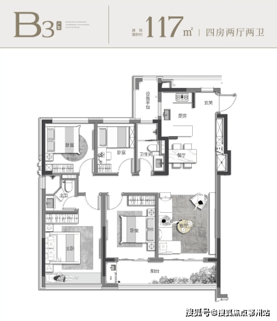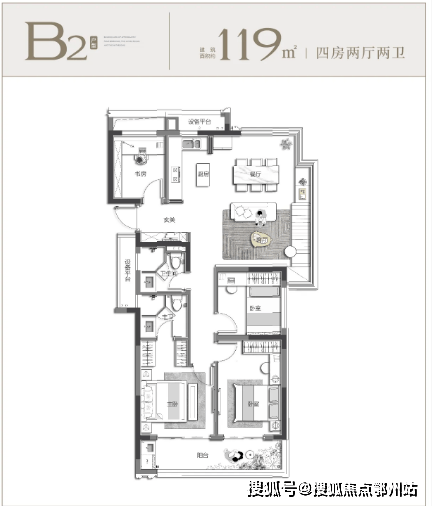 当家庭步入二孩时代或三代同堂阶段, “空间够不够用、隐私保不保障”成为新的需求焦点,约 117 ㎡户型则以极致设计,完美解决成长型家庭的所有顾虑。