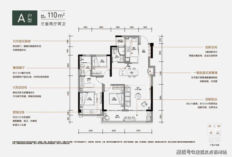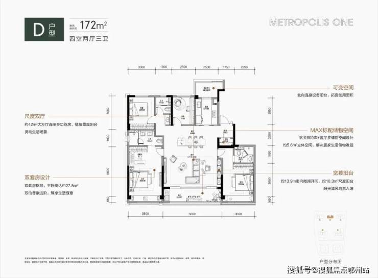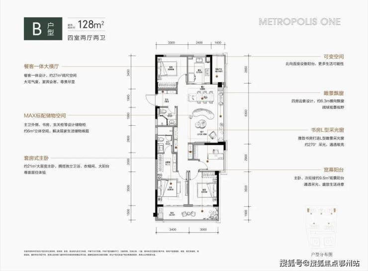 ①四房边套设计,约6.3m横向飘窗