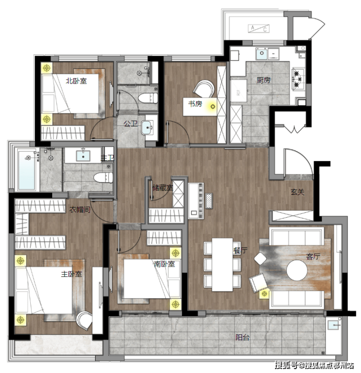 南向3.5面宽,在105㎡面积段做南向餐客横厅并连通景观阳台,是该户型加分项。公卫三段式卫浴设计,干湿分离;双卧朝南带飘窗,主卧套房